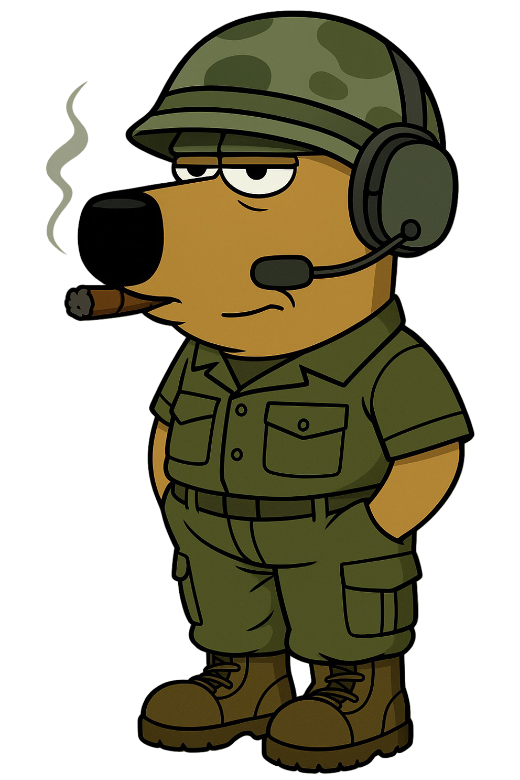 Trained in meme raids, chart ambushes and psychological shitposting, Sergeant Guy represents the American spirit of digital resistance 🇺🇸. While frogs and cats play politics, he stays in the shadows — locked in, puffing on a stogie, waiting for the next mission.